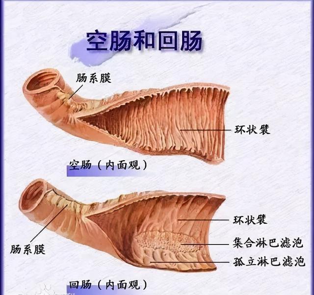 空、回肠的区别:空肠粘膜皱襞高且密,壁厚色深,呈粉红色,回肠壁薄色浅,呈灰粉色;空肠的环状壁高而密集,回肠的则矮而稀疏;空肠的血管弓为1-2级,回肠的为3-4级;回肠粘膜内有长椭圆形集合淋巴滤泡,纵轴与肠管平行,长0.5-3cm位于对系膜缘,而在空肠内则很少见。
