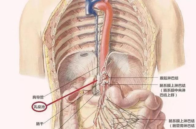 小肠粘膜内的淋巴管起自小肠绒毛的中央乳糜管,沿血管离开肠壁进入小肠系膜内淋巴结。肠系膜淋巴结数目不等,100-200个,可分三群,远侧群沿肠管排列,中间群沿血管排列,近侧群沿肠系膜上动脉主干排列,最后与腹腔淋巴结的输出管汇合成肠干注入乳糜池。