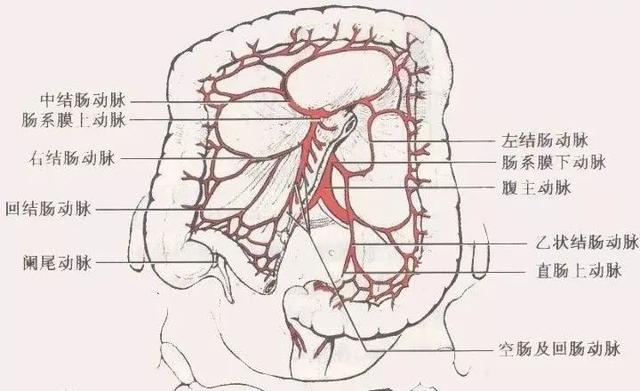 小肠的动脉来自肠系膜上动脉。肠系膜上动脉在小肠系膜内向右侧发出结肠中动脉、胰十二指肠下动脉、右结肠动脉和回结肠动脉。空、回肠动脉多在肠系膜上动脉发出结肠中动脉后向左侧发出,为10-20个小动脉分支,供应空、回肠。这些动脉支在到达肠壁前彼此吻合成动脉弓,再发出直血管进入肠壁。直血管是终末动脉,进入肠壁前互相没有吻合,进入肠壁虽有吻合但不充分,尤其在对系膜缘处。因此,小肠缺血时对系膜缘肠壁常先坏死。小肠切除时须作扇形切除,使对系膜缘切除长度较长,以保证吻合口血供良好。