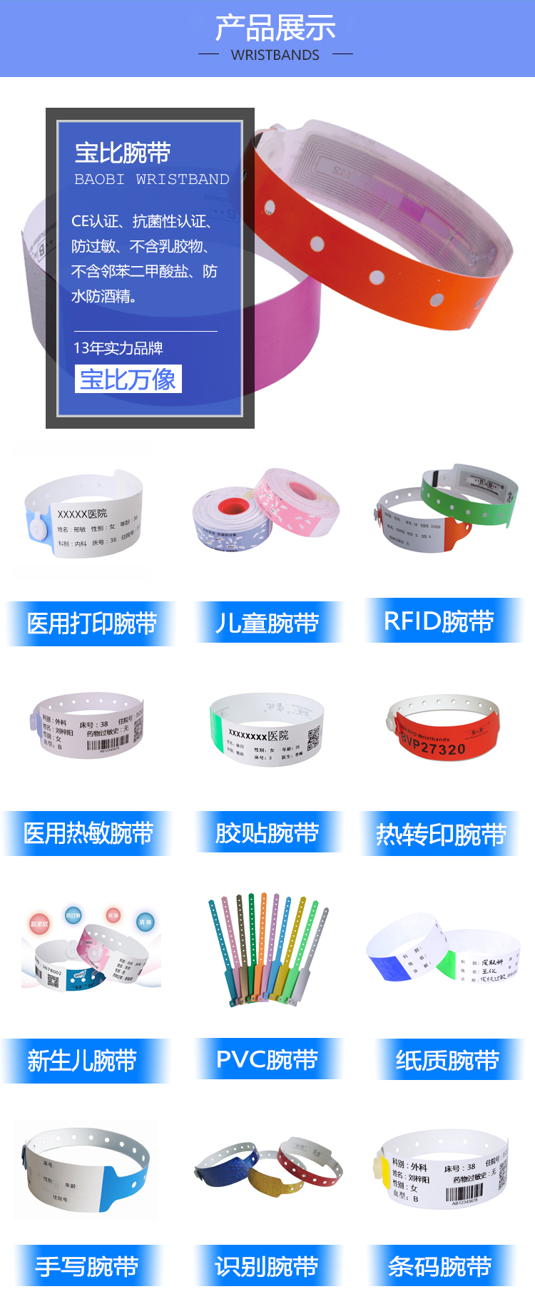 此外,我们的腕带有适合成人、儿童和新生儿佩戴的各种尺寸,支持定制,颜色丰富可选;从材质上分,我们的腕带有纳米硅腕带、pvc腕带、塑料腕带、纸质腕带、硅胶腕带等;从使用上分,我们有手写腕带和打印腕带;也有胶贴腕带和塑扣腕带,总之,总有一款就是你需要的。