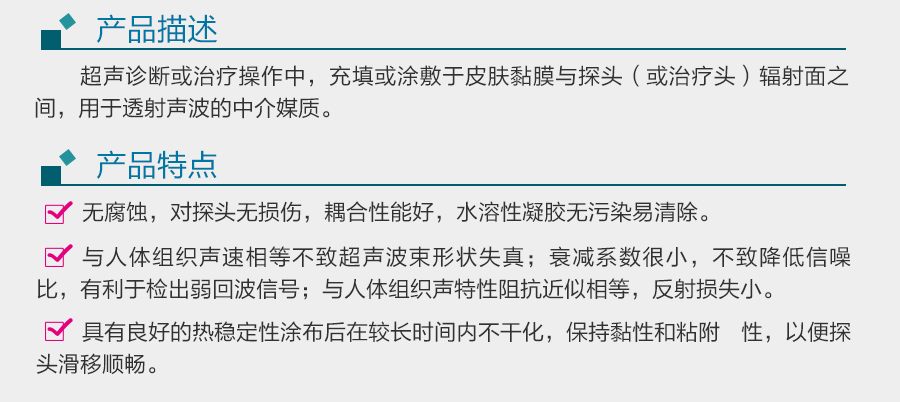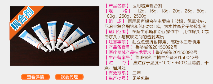 【产品名称】【产品类别】超声诊断仪【招商区域】全国【产品说明】【产品特点】1、无腐蚀,对探头无损伤,耦合性能好,水溶性凝胶无污染易清除。2、与人体组织声速相等不致超声波束形状失真;衰减