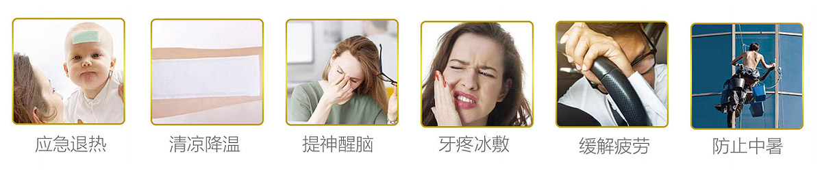 高分子凝胶含水量丰富、易吸热带走皮肤表面热量安全降温,清凉因子提神醒脑、消除疲惫、缓解压力,柔顺无纺布背衬,柔韧质轻、防潮透气、无毒无刺激性,亲肤材料无刺激、温和亲肤、粘性适中、贴敷持久。