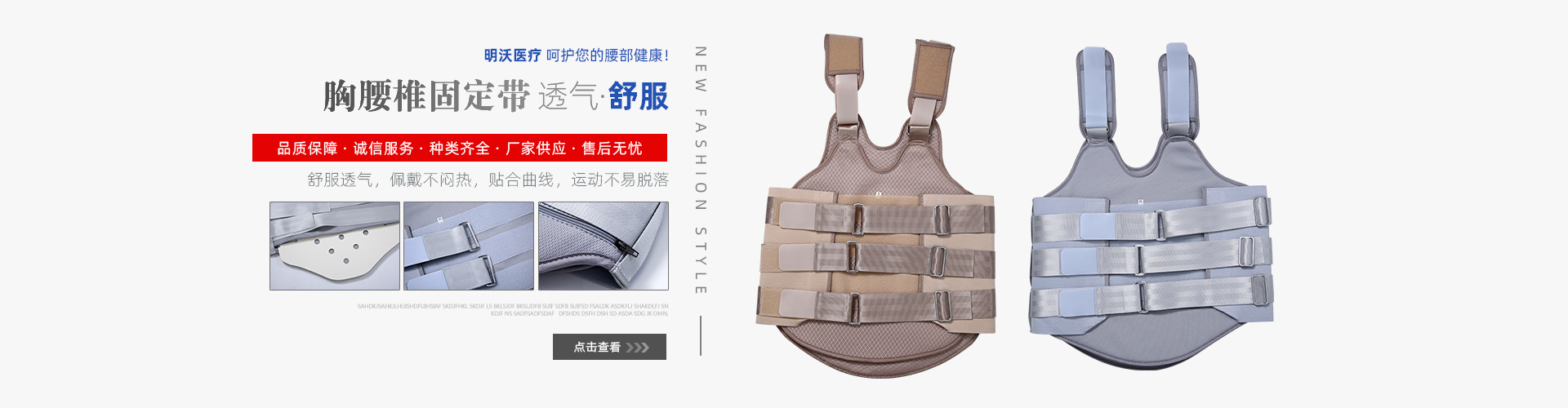 主要产品:各种规格弹力腰围、腰封、护腰带、固定带、牵引带、牵引架、外固定支具、四肢夹板、各个部位医用体位垫、约束带、医用拐杖、以及各种-次性卫生材料等。 我公司将以优异的质量、合理的价格、贴心的服务与你携手共进,并竭诚欢迎新老客户来我公司参观指导,进行面对面的交流合作。