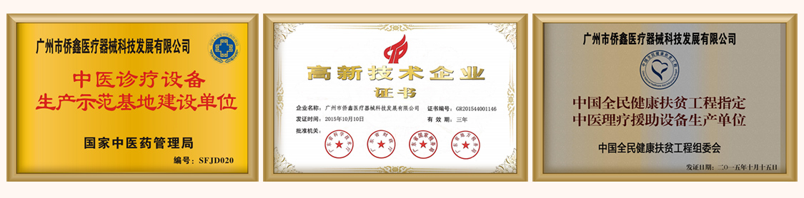 广州市侨鑫医疗器械科技发展有限公司是中医药管理局中医诊疗设备 生产示范基地,产品被列入“中医药管理局第一批中医诊疗设备推广目录”!