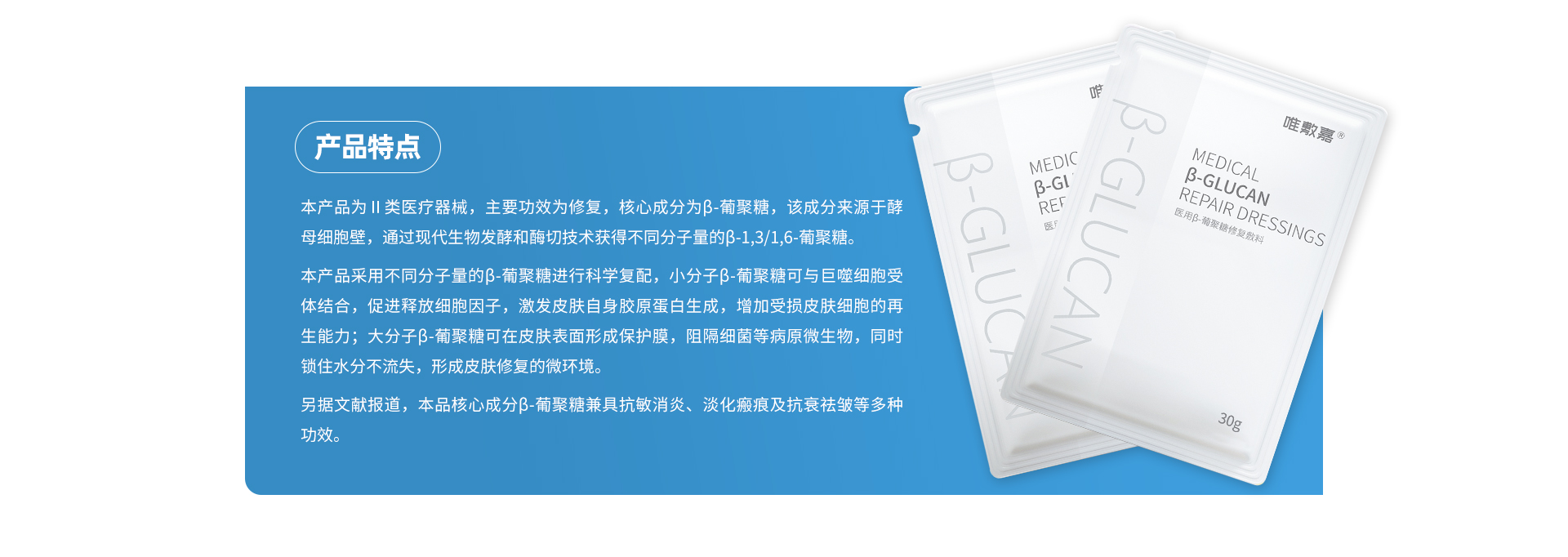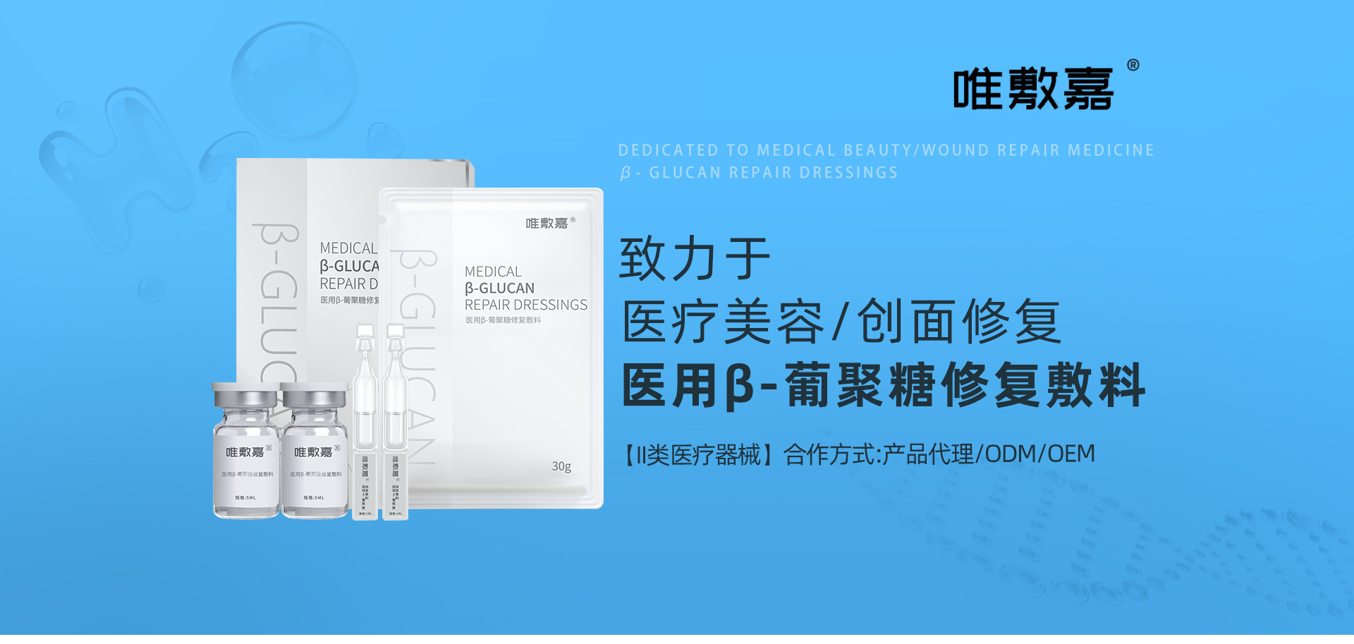 【产品类别】敷料【批准文号】黑械注准20232140027【招商区域】全国【产品卖点】酵母β-葡聚糖不仅具有透明质酸钠、重组人源化胶原蛋白的基础功能,还具有激活巨噬细胞等免疫细胞的生物活性,降低炎症反应,提高免疫力,具备新一代敷料产品的功能特点【产品说明】唯敷嘉®医用β-葡聚糖修复敷料适用范围:通过在创面表面形成保护层,起物理屏障作用。为创面提供愈合的微环境,促进创面愈合,用于小创口、擦伤、切割伤等非慢性创面及周围皮肤的护理。产品分类:医疗器械(Ⅱ类)型号:Ⅰ型、Ⅱ型生物性能:Ⅰ...