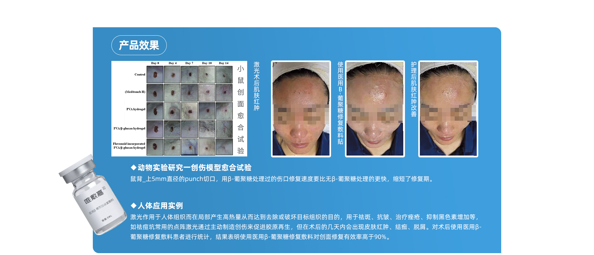 【产品类别】敷料【批准文号】黑械注准20232140027【招商区域】全国【产品卖点】降低炎症反应、促进创面愈合、保湿补水抗衰老【产品说明】【产品名称】医用β-葡聚糖修复敷料【型号规格】Ⅰ型:3g、4g、5g、7g、10g、12g、15g、18g、20g、25g、27g、30g、33g、35g。【产品性状】本品非织造布平铺后外周圆滑无缺口,各切口平滑整齐,无脱屑、脱丝现象;溶液为无色或乳白色至淡黄色液体...