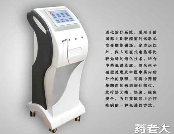 甲类医保,全国,一个医院每年至少赚100万。透化治疗系统是第三代给药方式,采用目前国际上比较超前的运动式交变螺旋磁场、定谱远红外、深入可变式电热等透化技术,结合中药低温萃取、纳米孢子破壁处理及中医中药内病外治的原理,可将中药精华靶向的送到病灶部位。此疗法无痛、快速、绿色安全,此过程中不会改变药物的结构和性质,为目前国际上治疗疾病的一种先进的康复理疗方式,真正实现了无痛、无创靶位精确治疗。 (一)透化治疗系统的原理介绍: 透化治疗系统主要由三大部分组成:1.主机2.透化头3.中药热敷透化垫。 中药热敷透化垫是将38种中草药,经过提纯、低温萃取、纳米孢子破壁处理后,结合远红外材料精制而成,利用透化治疗系统内所产生的运动式交变螺旋磁场、深入可变式电热等透化技术,把药物经过皮肤或粘膜透入机体的治疗方法。透化治疗系统的电磁、电热和远红外使药物粒子获得定向转运的动能,药物分子和粒子快速的穿透皮肤的粘膜,将药物直接送达到病变部位,并且能够促进了药物分子由细胞外向细胞内的转运,单向导入深度和宽度均可达8-10CM,从而达到快速治疗疾病的目的。 (二)透化治疗系统特点: 2004年8月美国著名科学杂志《Popular Science》称该方法为“第三代”给药方式,全美100项最具创新意义的科技成果”,该方法同时获得的了2008年千禧科技奖,该疗法的特点有: (1)电磁、电热、远红外和药物综合作用,不仅能将药物透入体内,同时保持原有药物性能; (2)与传统给药方式对比,它可以使药物在病变靶位组织内形成高浓度聚集区,保证了药物疗效,同时避免口服药物在肝脏的“首过效应”和胃肠道的降解破坏,也避免了传统静脉和口服给药方式药物必须通过血液(血药浓度)才能到达病变部位,减少了肝肾损害和对正常组织的损害等优点,真正的做到了高靶位浓度,极低血药浓度; (3)无电刺激现象,不发生电灼伤,操作简便,安全、几无不良反应等优点,是对传统给药观念的重大突破。备注:目前中药热敷透化垫根据成份不同,分为四类 一、温肺 止咳 平喘 主要针对慢性气管炎、慢性支气管炎、哮喘、咳嗽、肺气肿、肺心病等 二、活血 温经 通络 主要针对脑梗、中风偏瘫病人的恢复 三、祛风 除湿 止痛 主要针对股骨头坏死、强直性脊柱炎、腰椎间盘突出、颈椎病、肩周炎、骨质增生、滑膜炎等等 四、温中 散寒 通经 主要针对慢性肠炎、慢性胃炎等等