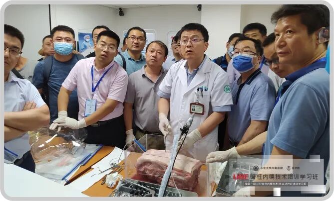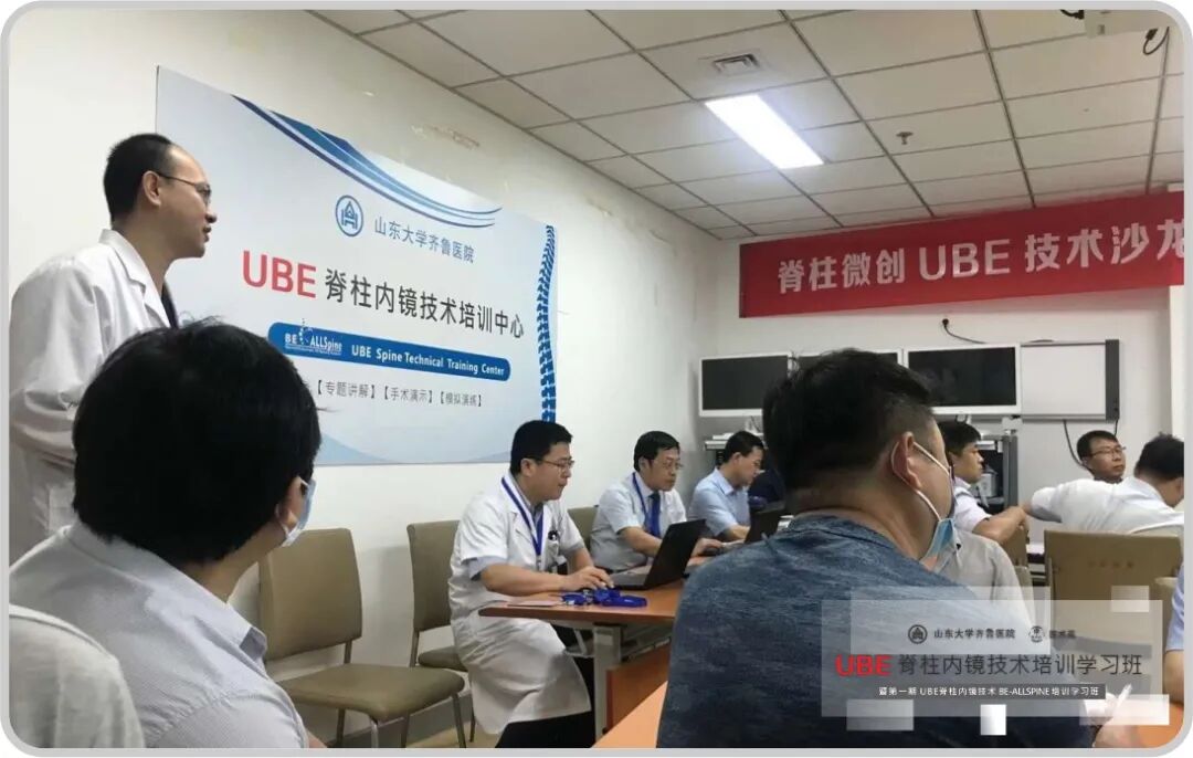 此次培训在山东大学齐鲁医院门诊楼7D培训室举行。结合UBE技术理论和临床实践本次沙龙分为专题讲解、手术演示、模拟演练三方面内容进行;刘新宇教授致开幕词;祁磊教授、蒋振松教授、鹿洪辉教授、刘新宇教授、张建新教授先后做了“UBE的基本理念和在腰椎疾病中的应用”、“UBE技术在椎管减压手术中的应用”、“UBE早期开展的体会——陷阱与技巧”、“UBE技术在腰椎融合中的应用”、“UBE技术与Pe-TLIF技术在椎管狭窄中应用的对比分析”等精彩的学术报告;各位教授通过生动形象的现实举例以及诙谐个性化的语言描述把UBE典型案例分析、UBE技术在临床应用中的技巧与心得阐述得立体实际,让在场的各位学员更有效地把此技术应用到实际工作中,造福一方的脊源性疾病患者。