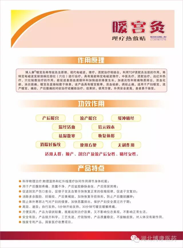 暖宫灸本品是依据中医热敷理疗原理而制成的产品。 本品运用化学氧化产热技术,使该产品自行发热,起到缓解疼痛的作用。灸法 享有国家收费编码 医保可报销烫熨治疗:470000013